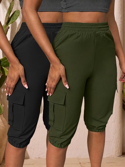 2pcs Women’S Solid Color Comfortable Casual Shorts with Multiple Pockets – Fashionable Crop & Cargo Shorts, All-Season Wear, Casual Attire|Cargo Shorts|Comfortable Shorts