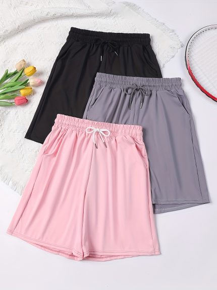 3pcs Women’s Lightweight High-Elasticity Drawstring Shorts with Front Pockets – Loose-Fit Casual Shorts for, Workouts & Summer, Machine Washable, Blacku002FGreyu002FPink, Shorts, Summer, Solid Color Design, Highelasticity Fabric