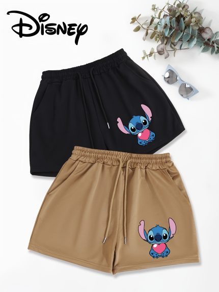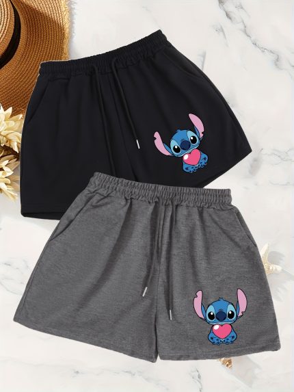 2pcs Stitch Graphic Drawstring Shorts – Black & Brown Casual Loose Fit Shorts with Slant Pockets, Polyester, Spring & Summer Women’S Clothing, Casual Wear|Playful Design|Polyester Fabric