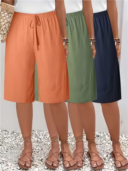 3pcs Women’s High-Waisted Straight-Leg Shorts – Summer Casual Elastic Waistband with Faux Drawstring, Solid Color Machine-Washable Non-Stretch Fabric for Casual Attire