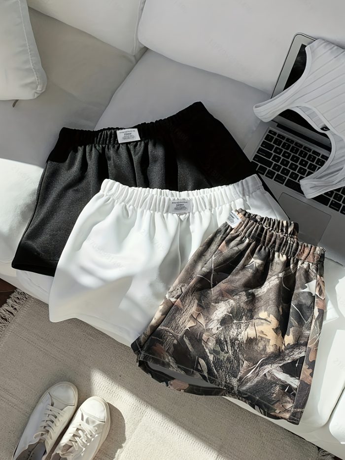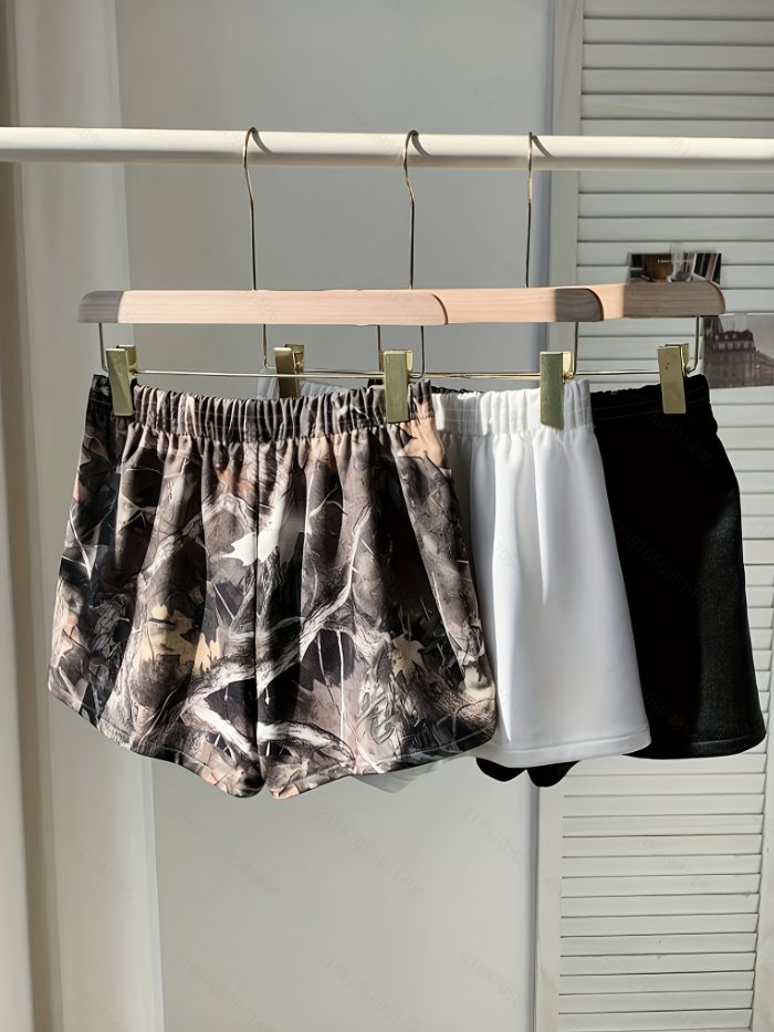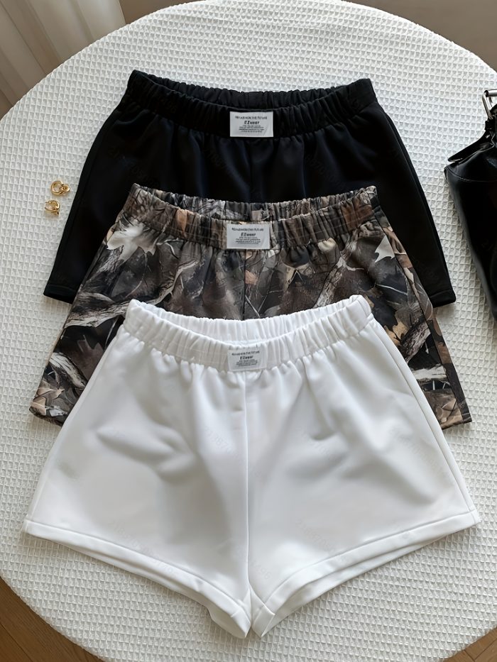 Home Women's Shorts 3pcs Women’S High-Waist Elastic Shorts – Black, White, and Camo Print, Casual Stretchy Drawstring Shorts for All Seasons, High Waisted Shorts
