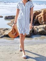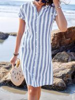 Home Women's Dresses Asymmetrical Hemline Elegant Women’S Striped V-Neck Midi Dress – Casual Short Sleeve, Button Front, Lightweight Polyester, Perfect for Summer Beach Outings, Beach Dress
