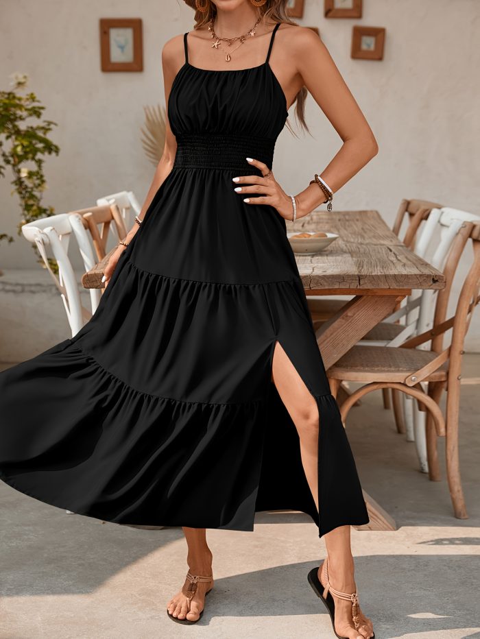 Description The Smocked Printed Wide Strap Tiered Dress is a delightful and playful choice for warm weather occasions. This dress