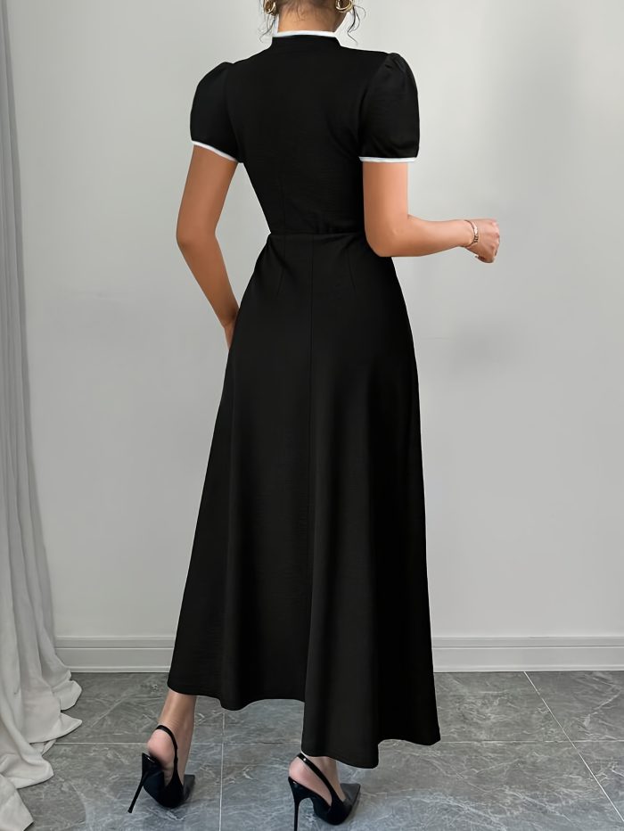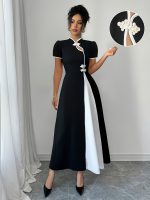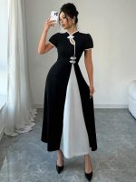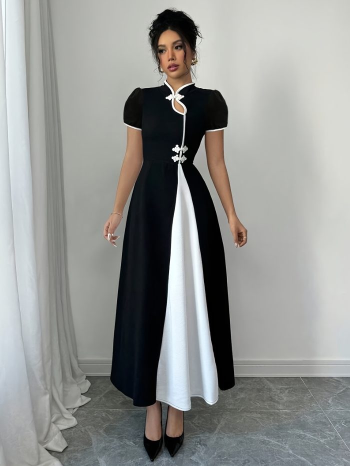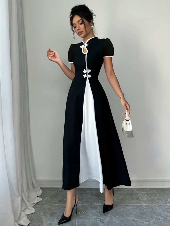 Elegant Pencil Dress Elegant Black and White Pencil Dress | Stand Collar, Button Front, A-Line Design, Perfect for Adult Women, All Seasons – Stylish Attire, Classic Aline, Stylish Heels