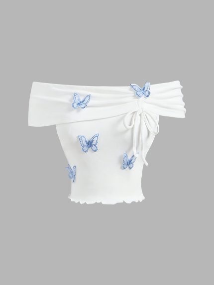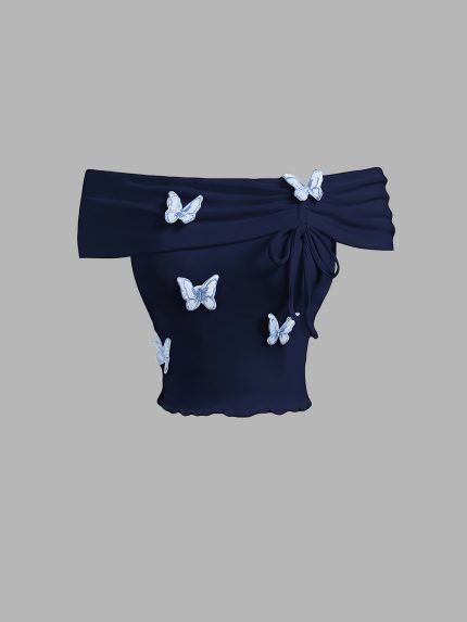 Chic Navy Blue Off-Shoulder Top with Butterfly Appliqu?? and Ruffled Hem – Stretchy Polyester Blend, Elegant Knot Detail, Machine Washable – Women’s Fashion, Summer Fashion | Offshoulder Blouse | Smooth Texture Fabric