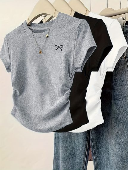 3pcs s’ Pleated Round Neck Short Sleeve Bow Print Casual Versatile T-Shirt Top