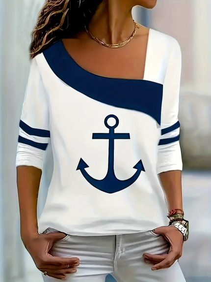 Long Sleeve Color Block Crew Neck Elegant Button Front T-Shirt for Spring & Fall, Women’s Clothing