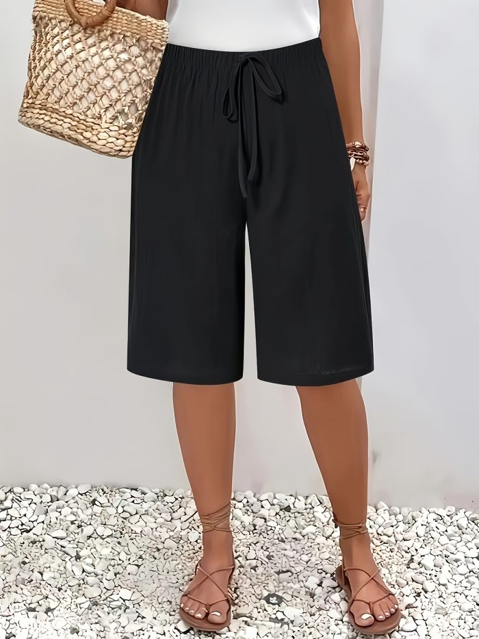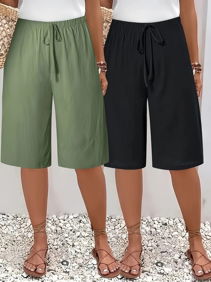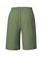 Home Women's Shorts Two-piece Set of European and American Solid Color Women’S Casual Shorts with Elastic Waist and Fake Drawstring Detail
