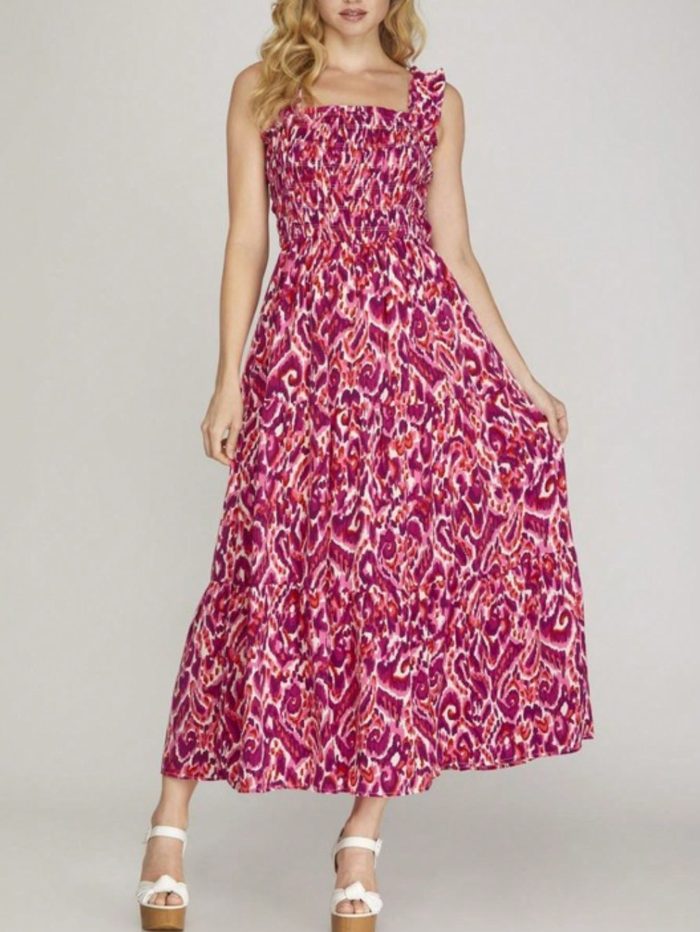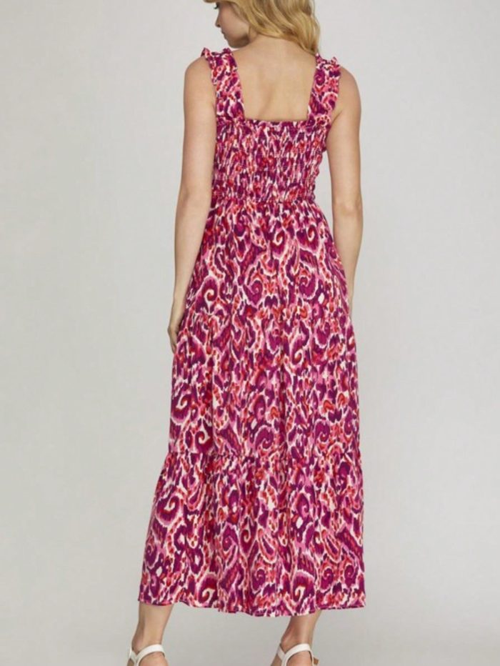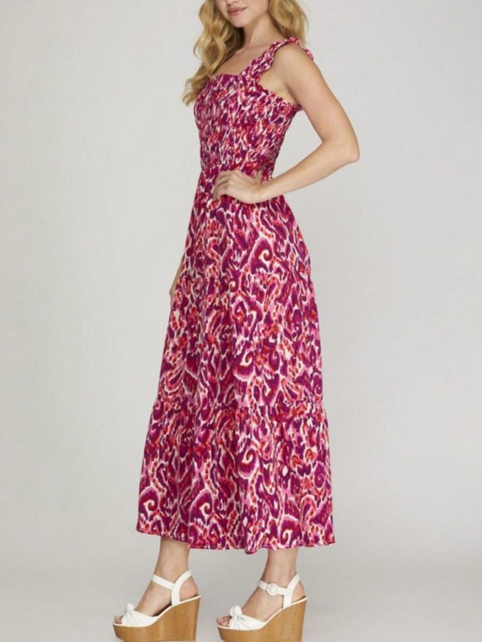 The Smocked Printed Wide Strap Tiered Dress is a delightful and playful choice for warm weather occasions. This dress features a smocked bodice for a comfortable fit. wide straps for added support. and tiered layers for a flowy and feminine silhouette. The printed design adds a touch of fun and flair to the dress. Pair it with sandals or wedges for a chic and effortless look that is perfect for summer outings and events.
