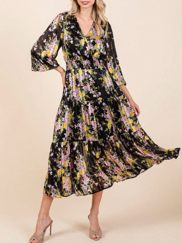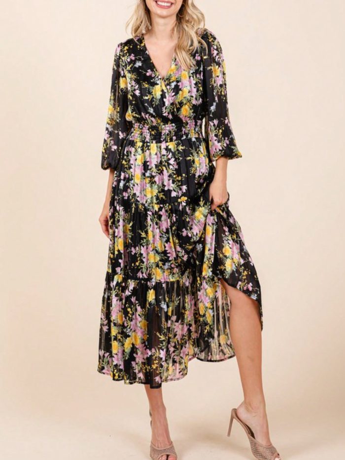 Womens Casual Floral Boho Chic Ruffle Sleeve Wrap Maxi Dress Black Yellow Pink Blossom Print Three Quarter Length Sleeve V Neck Elastic Waist Flowing Tiered Skirt Spring Summer Party Beach Vacation