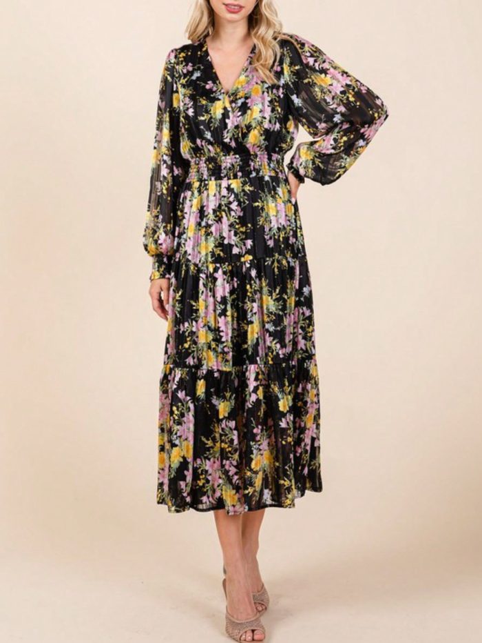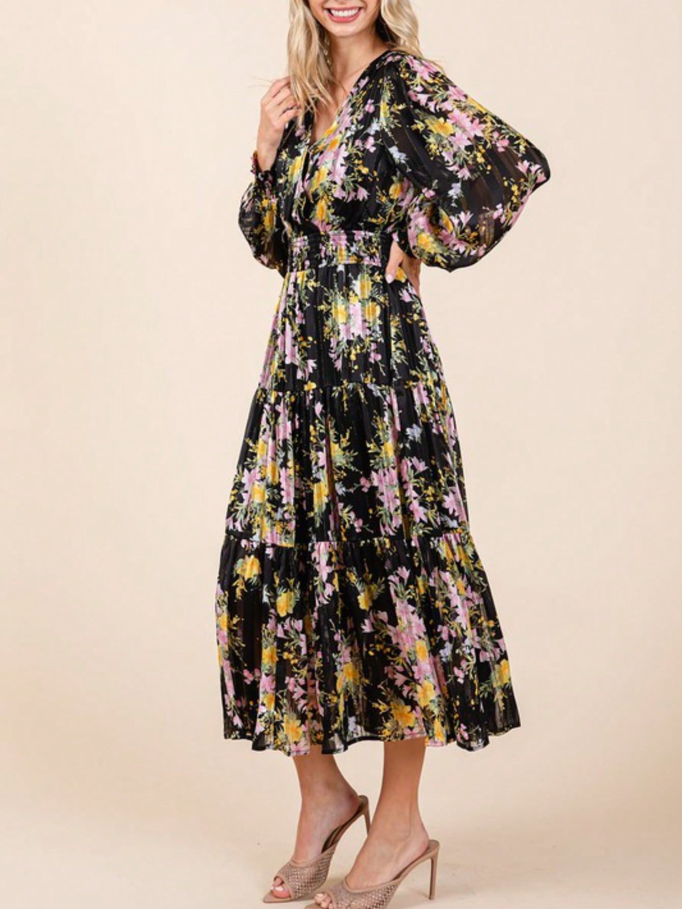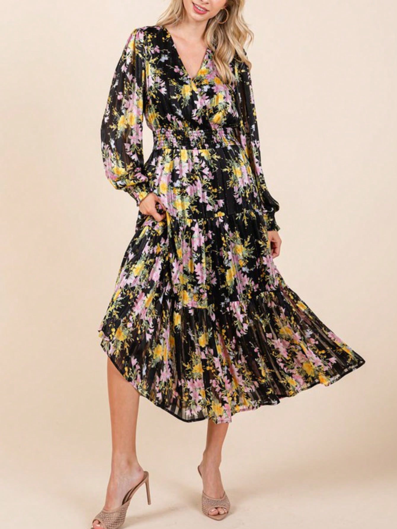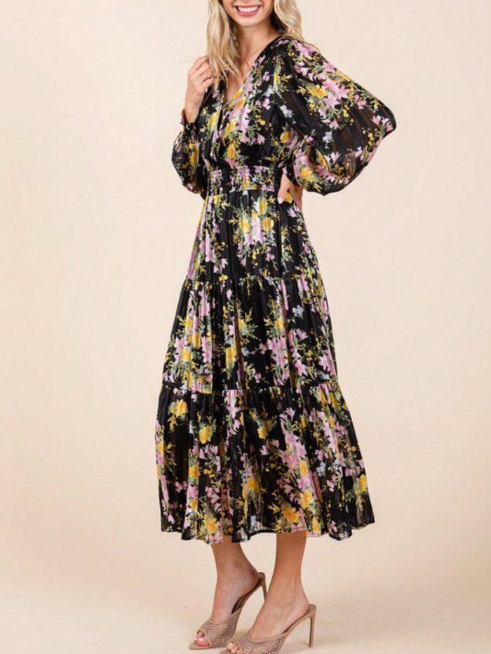 A flower print satin lurex stripe smocked midi dress is a stylish and elegant dress that combines various design elements for a unique look. The flower print adds a feminine and romantic touch to the dress. while the satin fabric gives it a luxurious and silky appearance. Lurex stripes add sparkle and shimmer to the fabric. creating a subtle yet eye-catching detail. The smocked waist provides a fitted and flattering silhouette. while the midi length falls below the knee for a sophisticated look. This type of dress is perfect for special occasions or events where you want to make a statement with a blend of florals. shimmer. and a structured fit.