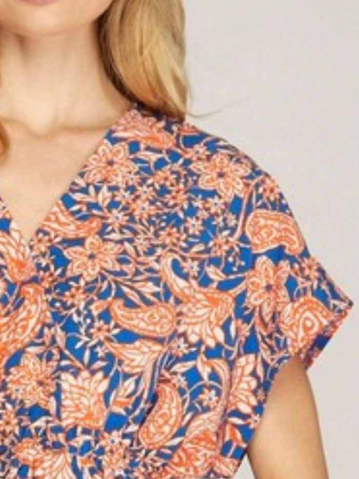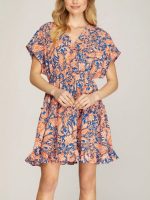 Womens Casual Plus Size Boho Chic Paisley Print Ruffle Hem Mini Dress Blue Coral Pattern V Neck Cap Sleeve Above Knee Flowy Summer Beach Vacation Party Sundress
