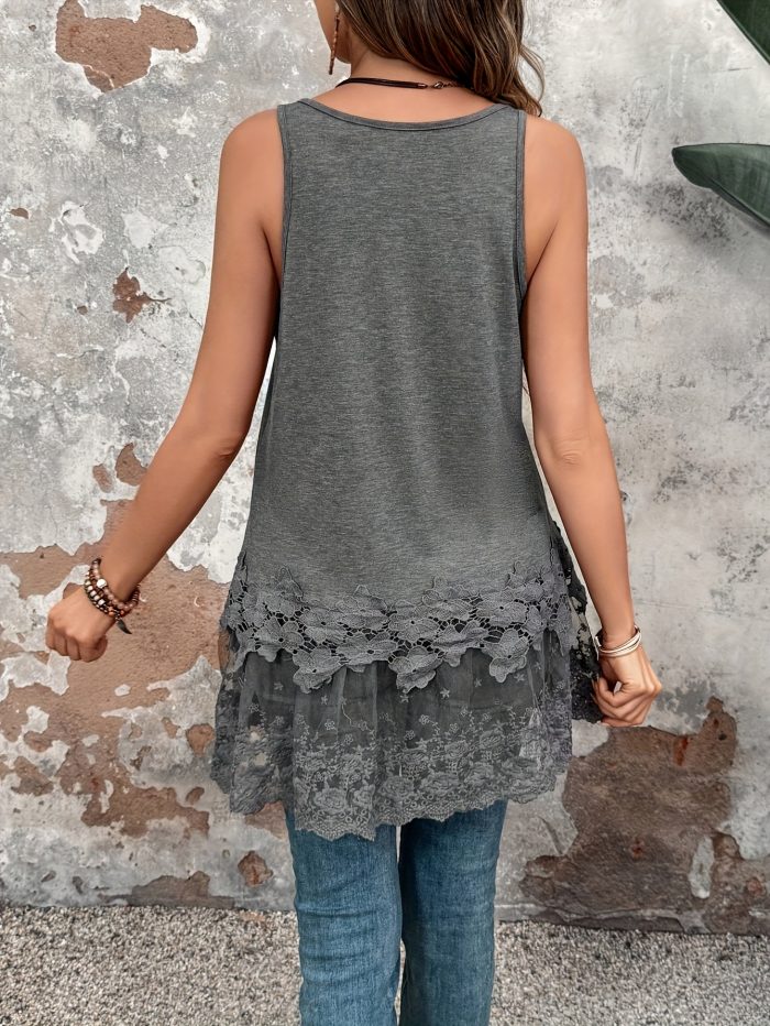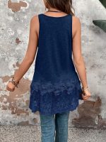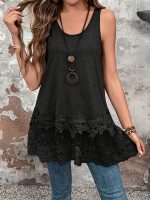 Women’S Casual Summer Tank Top with Contrast Lace Detail – Sleeveless, Round Neck, Black and White Ruffle Hem, Polyester Fabric, Perfect for Casual Attire, Summer Tank Tops
