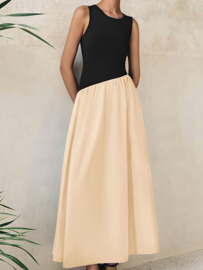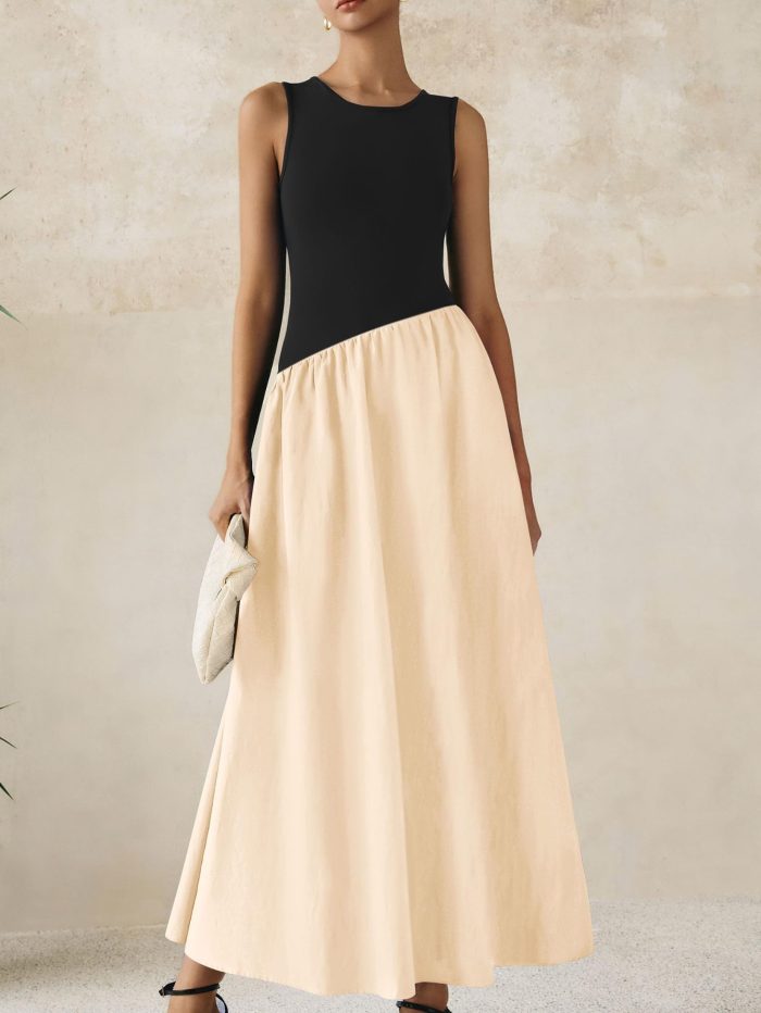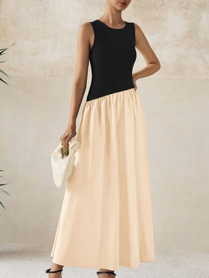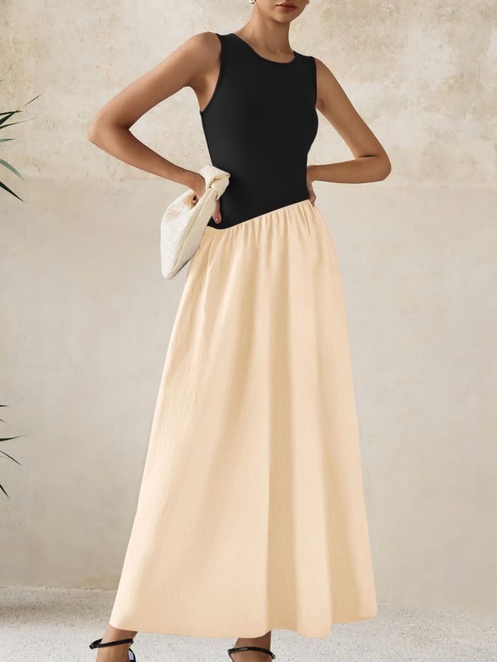 Women’s Elegant Maxi Sundress – Sleeveless Black & Beige two-tone dress, Flowy A-Line skirt for Beach, Parties, Everyday – All-Season Casual to Formal Outfits, Beach Dresses