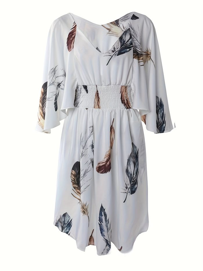 Women’s Elegant V-Neck Batwing Sleeve Dress – White with Brown Botanical Print, A-Line Mid-Length Summer Dress, Fitted Top & Flowy Hem, Hand Wash Only, Casual Chic Wear, Natureinspired Print