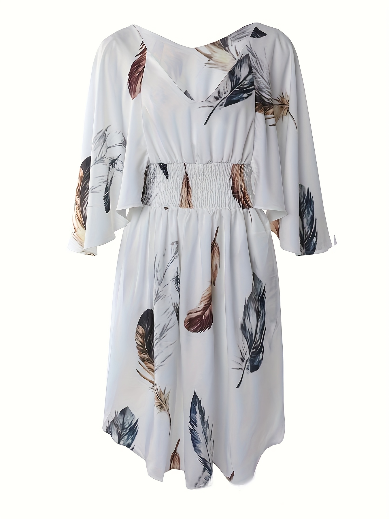 Home Women's Dresses Women’s Elegant V-Neck Batwing Sleeve Dress – White with Brown Botanical Print, A-Line Mid-Length Summer Dress, Fitted Top & Flowy Hem, Hand Wash Only, Casual Chic Wear, Natureinspired Print
