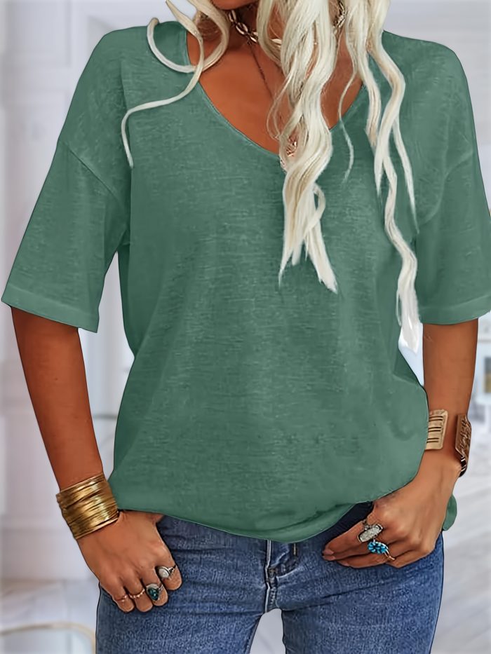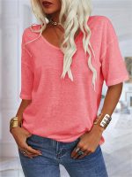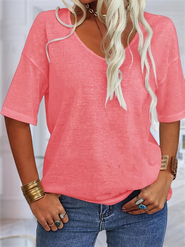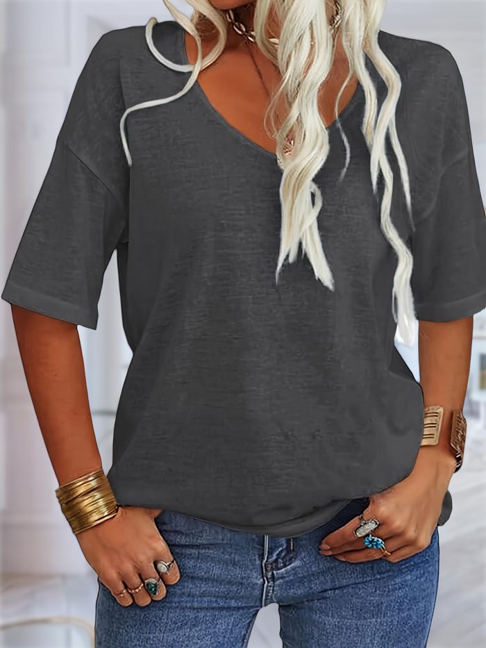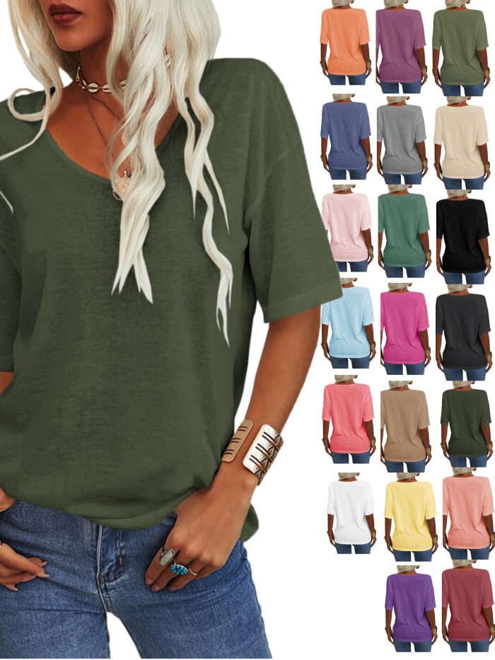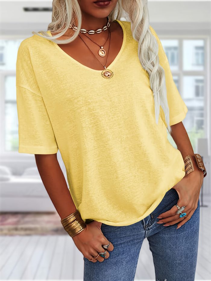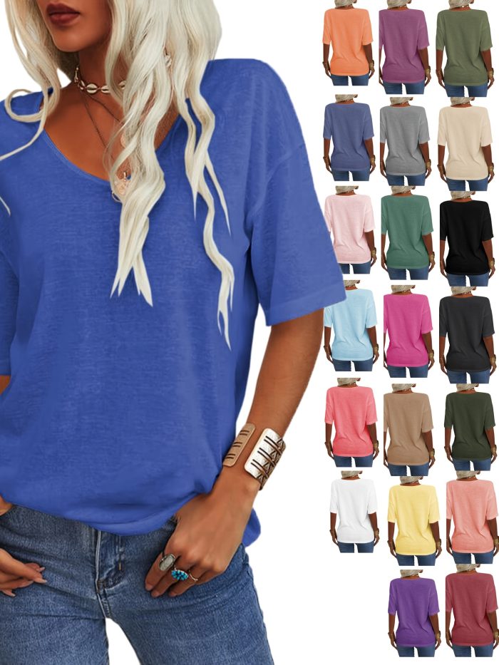 Women’s V-Neck Drop Shoulder Sleeve Solid Color Loose Short Sleeve Shirt