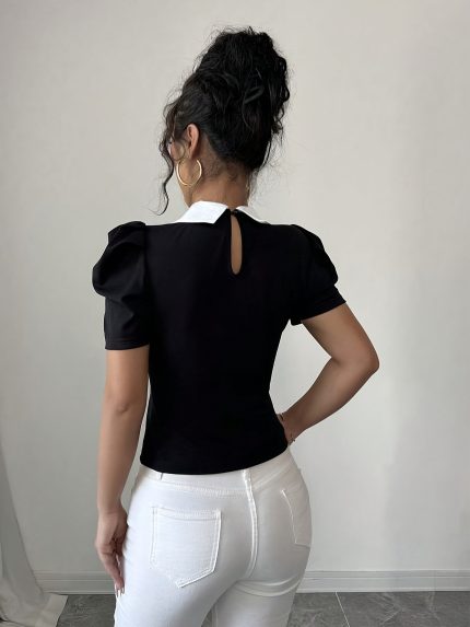 Women’s Elegant Black & White Contrast Pearl-Adorned Collar T-Shirt – Short Sleeve Summer Top with Flared Cuff Sleeves, Machine Washable Regular Fit Casual Shirt, Ladies T Shirts