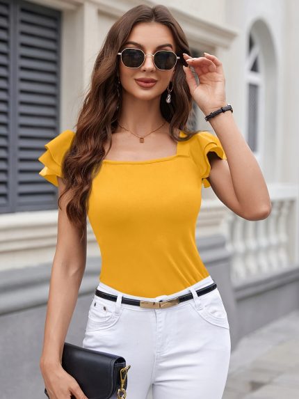 Elegant Summer Top Orange Elegant Women’s Summer T-Shirt | Solid Color Top with Ruffle Sleeves, Square Neckline & Backless Design, Lightweight Polyester for Casual or Summer Outfits