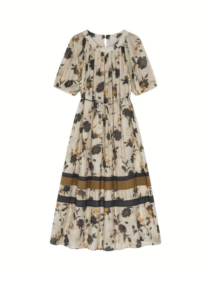 Home Women's Dresses XWI Women’S Floral Print Mid-Length Dress with Removable Belt – Short Sleeve, Round Neck, Lightweight Polyester for Springu002FSummer Beach Vacations, Beach Dresses