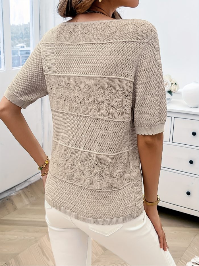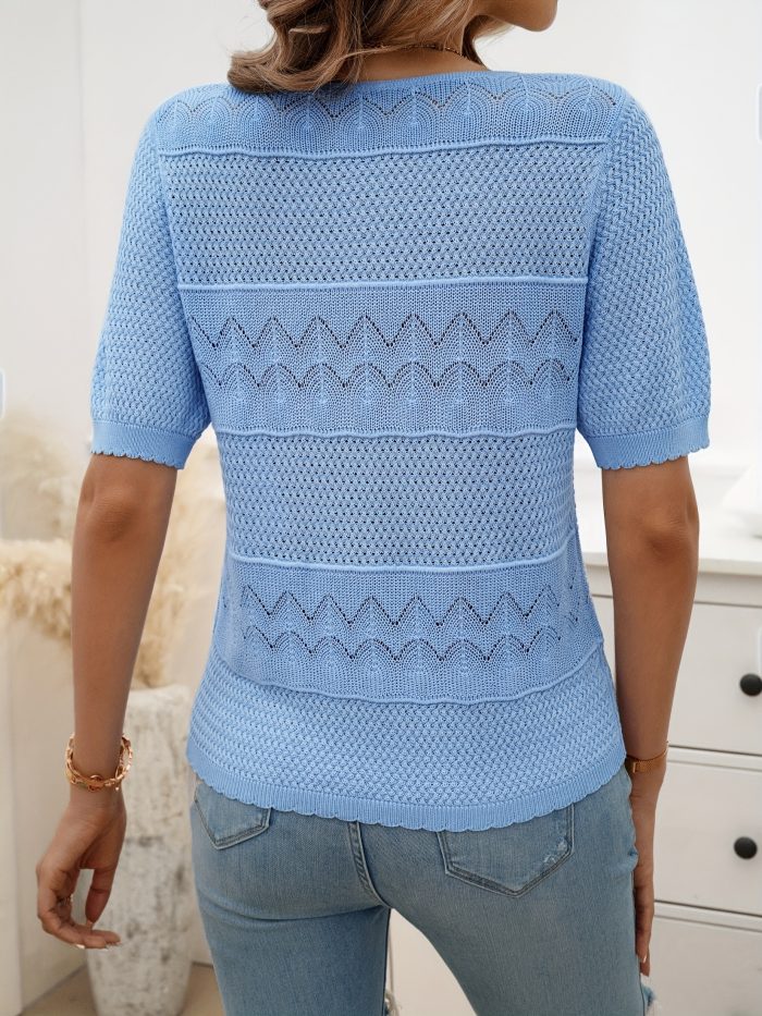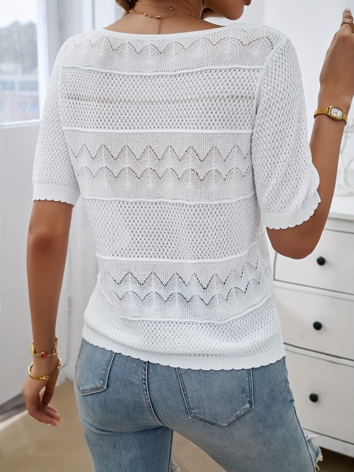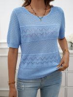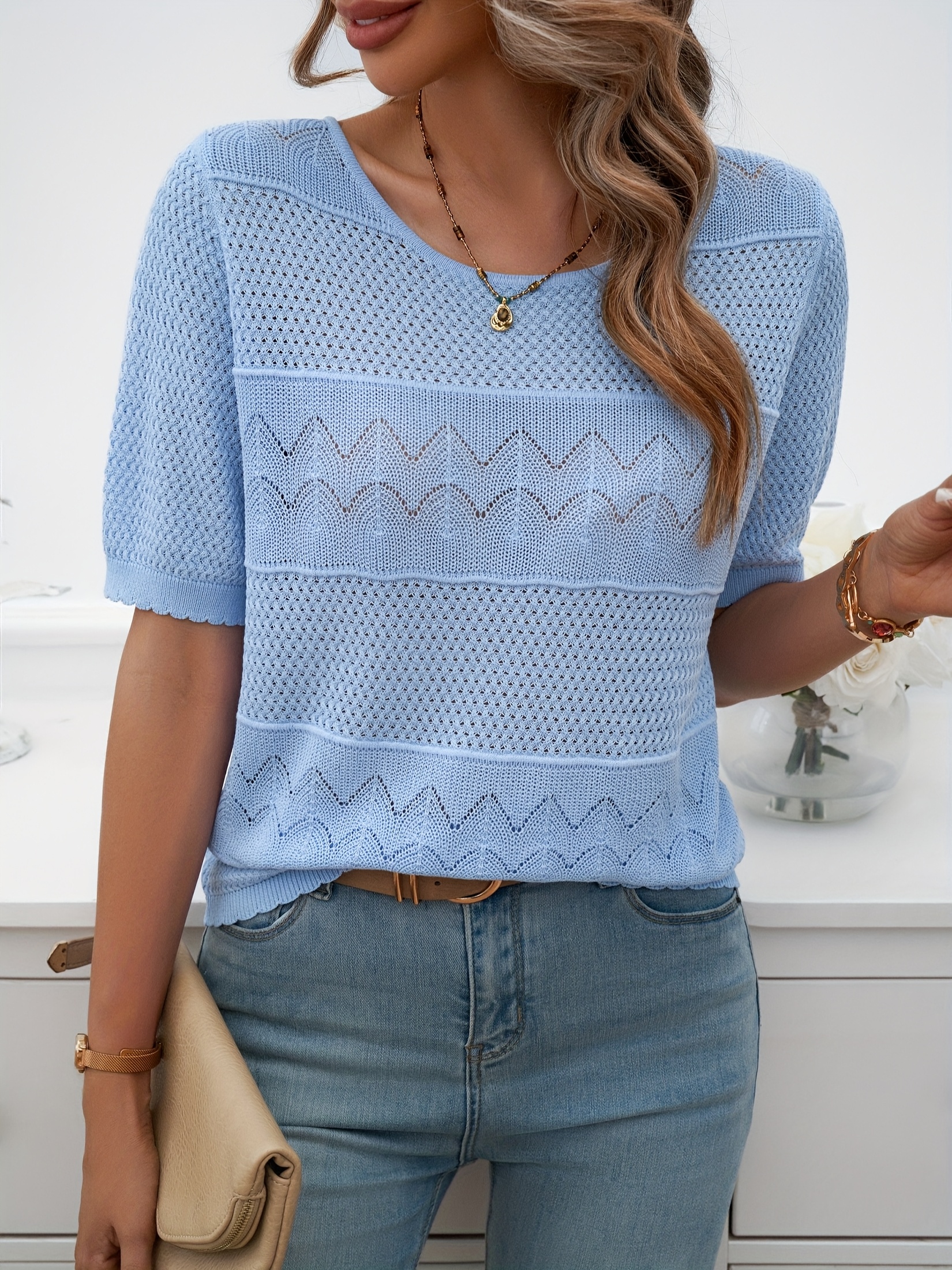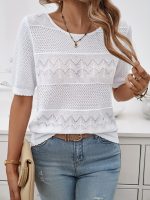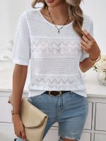 Home Women's T-Shirt ZAFUL Women’s Sexy Semi-Sheer Geometric Cable T-Shirt – Lightweight Petal Edge Short Sleeve Round Neck Top for Springu002FSummer, Machine Washable, Summer Fashion, Crochet Texture, Delicate Design