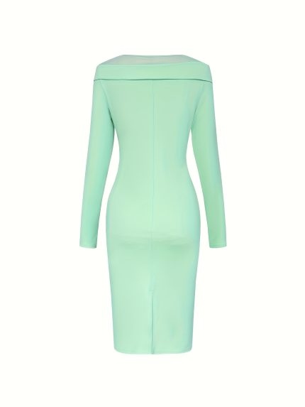 Elegant Mint Green Off-Shoulder Dress with Floral Embellishments – Long Sleeve, Bodycon Fit, Perfect for Adult Women, All-Season Wear, Formal Evening Gown | Offshoulder Dress | Polyester Fabric