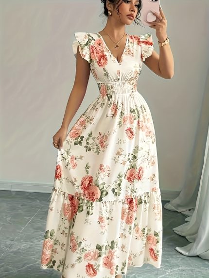 Elegant Floral Print Long Dress with Ruffle Detail, V-Neck, Cinched Waist, and Tiered Skirt – Perfect for Beach Vacations, Romantic Outings, and Fashionable Streetwear, Beach Dress