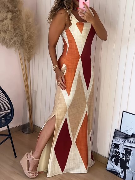 Women’s Elegant Loose-Fit Long Sleeve Geometric Print Dress with Pockets – Thin Spaghetti Straps, Adjustable Waist Cut, Machine Washable Pencil Skirt for Springu002FFall, Spring Fashion, Loose Fit, Durable Construction, Casual Chic