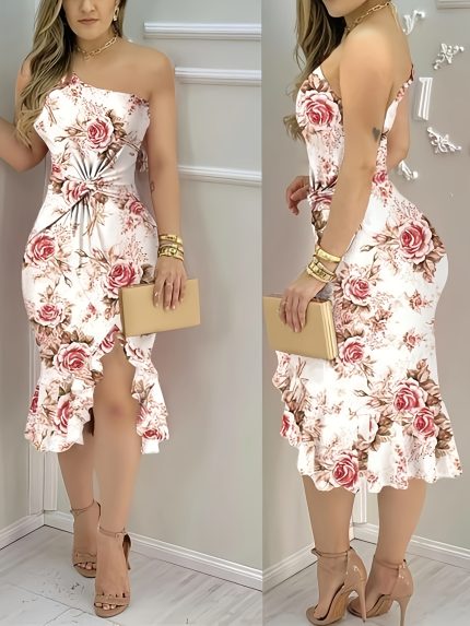Women’s Elegant Off-Shoulder Floral Print A-Line Dress with Asymmetrical Hem & Elastic Waist – Machine Washable Bodycon Summer Dress for Springu002FSummer Casual to Formal Events, Spring Event Attire | Sophisticated Craftsmanship, Cute Dresses