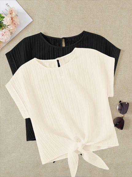 Women’S Elegant Red Ruched Short Sleeve Top with Tie-Front Detail – Lightweight Polyester, Springu002FSummer Casual Wear, Perfect for Beach or Vacation Outfits, Beachwear Top | Ruched Texture Top | Polyester Fabric