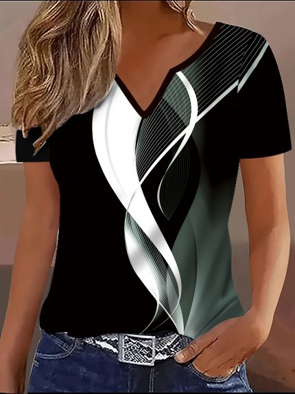 Elegant Women’S V-Neck Short Sleeve T-Shirt, 3D Printed Graphic Tee, Summer Casual Fashion Top with Abstract Design, Versatile & Stylish for Casual Attire, Versatile Fashion Top | Trendy Vneck Shirt | Stylish Casualwear
