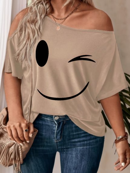 Elegant Off-Shoulder joyful Face Print Short Sleeve T-Shirt, Polyester Spandex Blend, Machine Washable – Springu002FSummer Collection