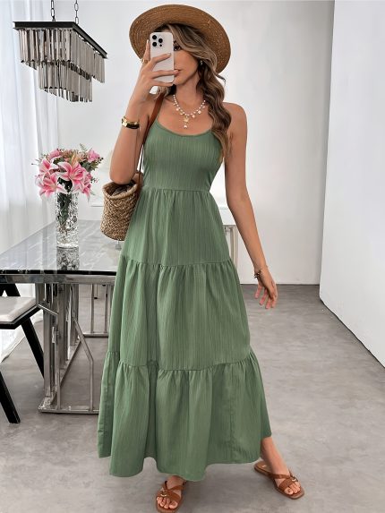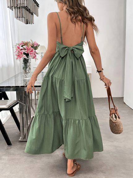 Green A-Line Dress Lightweight Polyester Elegant Green Sleeveless A-Line Dress for Women | Backless with Tie Detail, Ruffled Hem, Perfect for Spring & Summer, Beach Vacation Ready