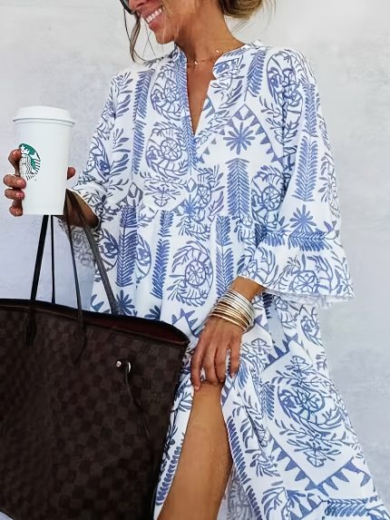 Floral Maxi Dress Lightweight Breathable Women’s V-Neck Floral Print Maxi Dress | A-Line Flared Hem Machine Washable for Spring Summer Fall Casual & Formal Occasions, Versatile Outfit, Middle Eastern Style, Intricate Patterns